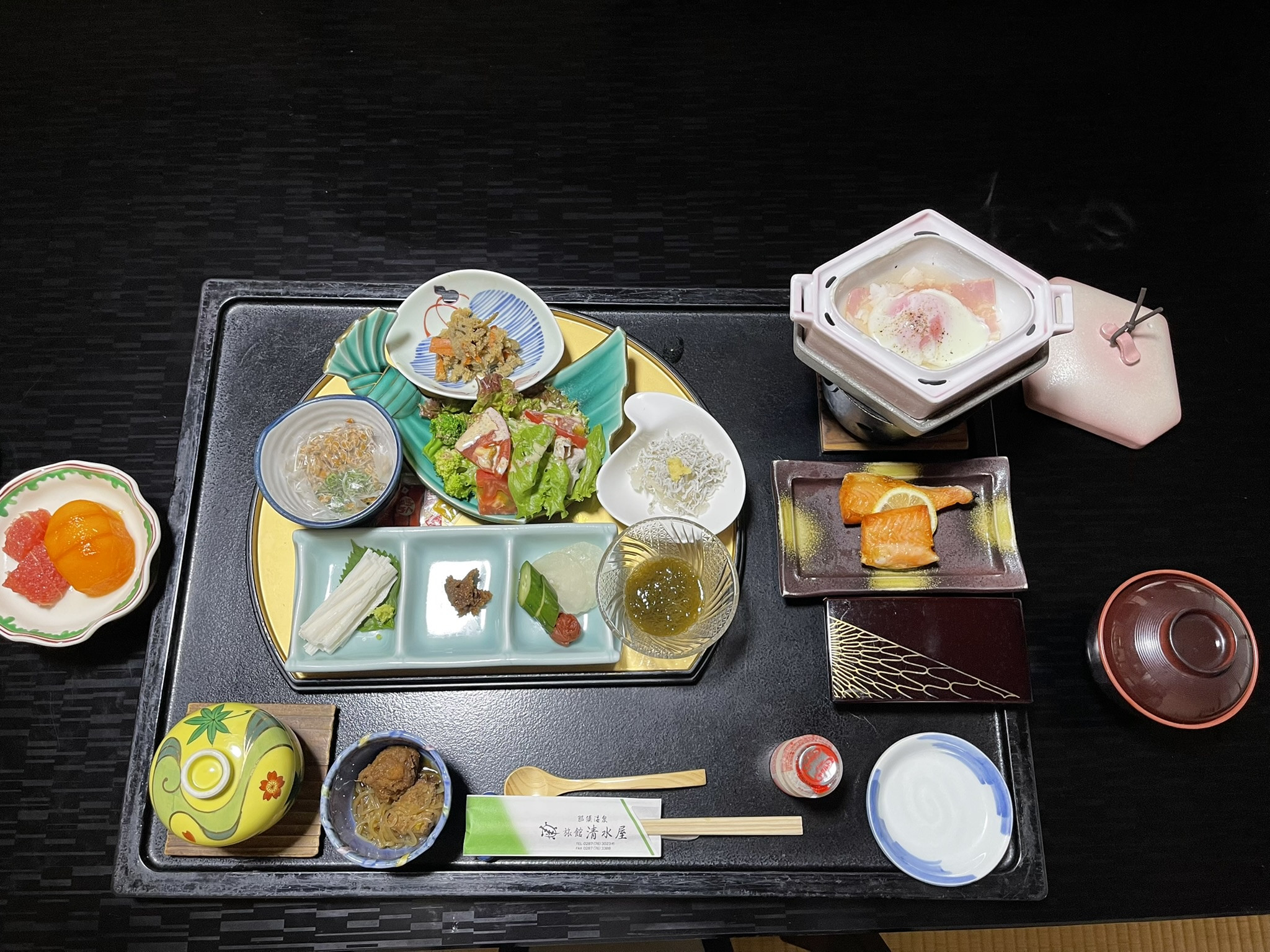 569:名無しさん@いい湯だな:2025/10/15(水) 20:10:59.76 ID:qWaCXswg0 紅葉が始まって混む前に栃木県北に三泊四日であちこち行ってきました。 580:名無しさん@いい湯だな:2025/10/15(水) 22:44:33.41 ID:qWaCXswg0 三日目 那須湯本温泉 清水屋旅館 じゃらんから予約5000ポイントとクーポン二千円分使用して18,800円 そこからさらにふるさと納税の宿泊券9000円分使用して一万円ほど、支払いはカードが使えないので現金のみ。一人プランだとちょい割高ですね。 最終日はまたしても有名温泉地、ここらへんは紅葉はまだ先かな。 立地建物 鹿の湯から少し離れた湯本一丁目バス停前の老舗旅館、雲海閣の湯小屋の向かいくらいの位置、駐車場は宿の向かい 雲海閣の湯小屋の隣の空き地。 三階建てで二階がフロント1階が大浴場、三階が客室になります、エレベーターがないので移動がちょっとめんどくさい。 館内はまぁカーペットがシミだらけだし、くたびれた感が漂ってます。 客室 本日のお部屋、三階角部屋の和室、トイレ洗面広縁付、空調はエアコンとストーブ、Wi-Fi冷蔵庫金庫テレビと一通り揃ってます。 部屋の眺望 おふとんはあらかじめ敷いてあるスタイル、古いですがお手入れはしっかりしているようで快適、エアコンは最近つけたのか2023年製で新しかった、ただしリモコンがないので今の季節は使えない模様。 那須湯本も近頃は普通に夏暑いのでエアコンがあるのはいいですね。 ただまぁ山の中なんで虫はいますね、夜でかい蛾が入り込んでました、どこから入ったんだろう。液体蚊取はなかったので気になる人は虫よけグッズ持ち込んだほうがいいかな、私はワンプッシュ持ち込みました。 581:名無しさん@いい湯だな:2025/10/15(水) 23:10:38.03 ID:qWaCXswg0 大浴場 浴場は1階男女別の内湯と露天、湯元には珍しく露天があるんですいいですね。温泉はもちろん鹿の湯、鹿の湯と行人の湯混合泉 手前がぬるゆで奥が熱湯、仕切りの穴と竹の樋でいい感じになるように温度調節されてました、珍しい方式ですね。 ぬるいといっても適温よりすこし熱め位で熱湯は普通に熱いです鹿の湯48度ほどではないけどかなり熱め。 カランはなく後付け感のあるシャワーのみ 謎の板張りスペースと観葉植物 おそらくここが以前は蛇口があるしかけ湯スペースだったのかな 露天の眺望。山と廃墟が見える 程よくぬるくて適温でした、狭いですが那須の清涼な空気の中温泉に入れるのは最高ですね。 道中の温泉も良かったですが鹿の湯の白く濁ってて臭くて熱くて舐めると酸っぱいヒリヒリする湯は最高ですね。いかにも温泉といった感じがします。 夕食 時間は六時からで準備ができると電話で教えてくれます、場所は二階のあいてる客室なので個室食ですね。 メインは牛肉の陶板焼き、厚いのに柔らかい、おそらく栃木和牛というやつかな。 前菜に鮑があったり、左奥のあえものがうなぎ入りだったり、お吸い物が魚のあら入りで全体的にいい食材を使ってますね、味もいいし美味しかったです。ご飯はおひつに茶碗三杯ほど あとから来たお吸い物と水菓子 朝食 同じ場所で時間は8時から。メインはベーコンエッグと焼鮭、朝食も美味しい。 総合評価は高め温泉が気持ちいいし何より露天風呂があるのが嬉しい、ご飯も美味しくてお部屋も快適で良かったです。 館内に自販機がないですがフロントでお茶を100円で売ってるのも良かったです。 難点は一人料金が高めなことですかね、二万五千円は結構高いかな。 ちなみに宿の評価とは別なんですが宿泊客が私だけだったので温泉を終始貸し切りで堪能できました、宿には悪いけど最高でした。 598:名無しさん@いい湯だな:2025/10/15(水) 23:56:20.31 ID:qWaCXswg0 高いっすよね、二人からだと18000くらいで一般的なのに一人だと跳ね上がるので。 露天付で珍しいので前々から気になってたので今回いろいろクーポンとか動員して止まってみたんですよね、コスパが良くない以外は良かったですよ。