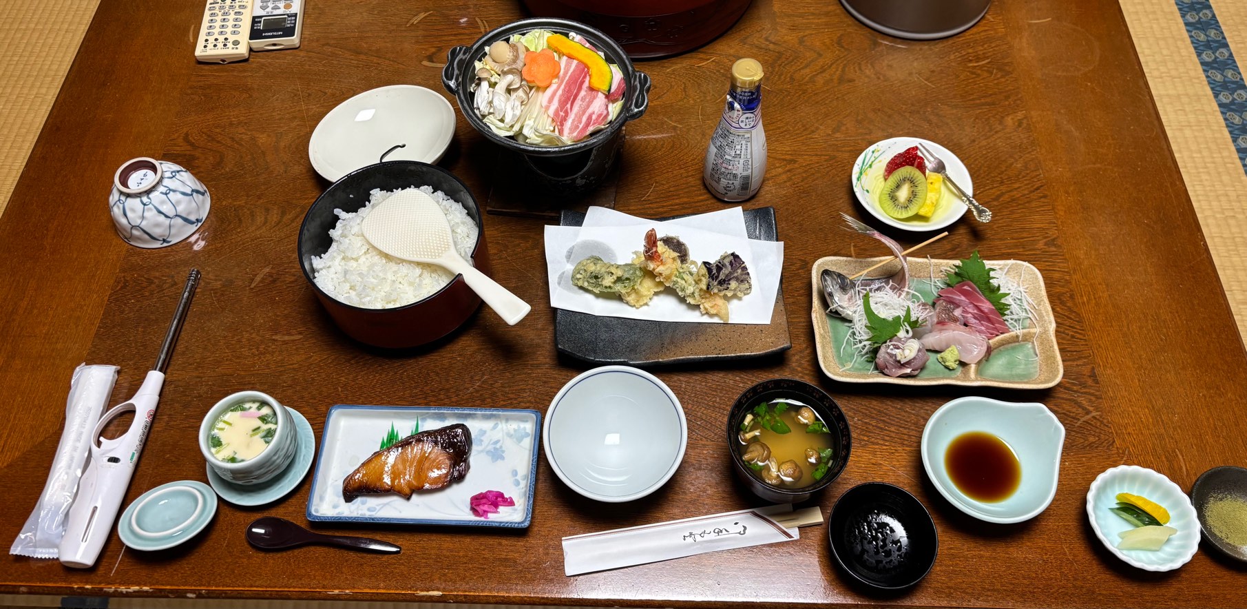 後書き忘れてたけど、風呂はちゃんと男女で分かれてる 食べ終わった食事は配膳毎廊下に置く、他の宿の部屋食と同じ形式 一応アレルギーとかあれば予約時のメモに書けば応じてくれるっぽいなんだったら子連れの家族とかも来るから苦手な物も対応できますよなんて言ってた お湯は癖のないさっぱりとした感触、じんわりと温まる