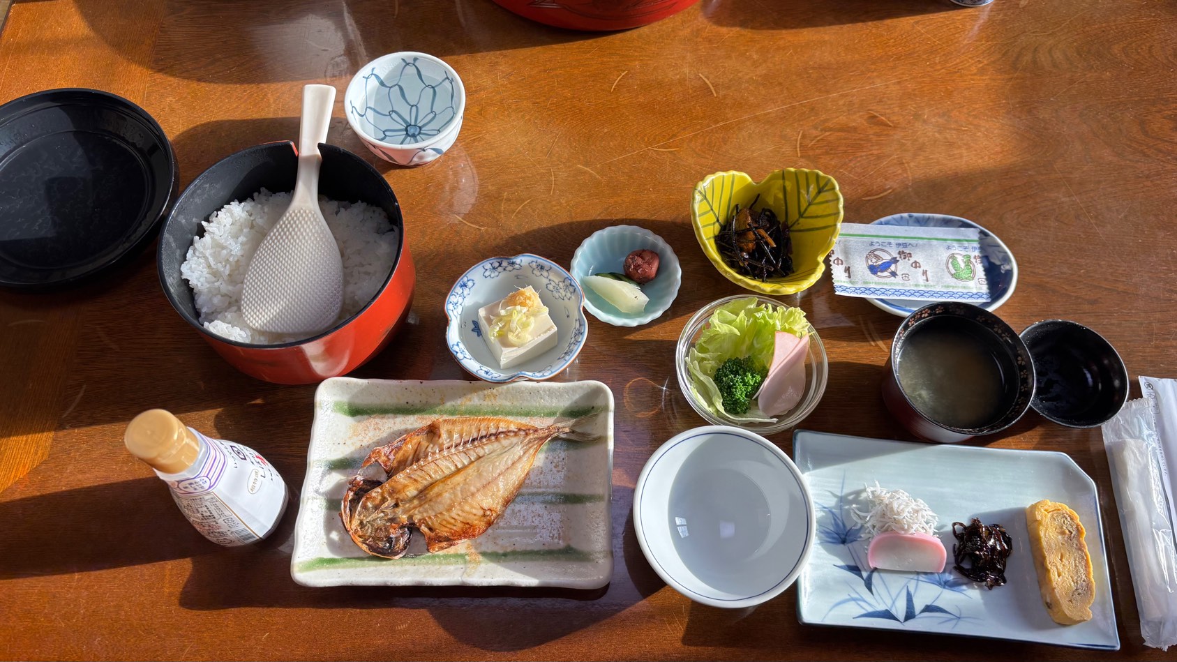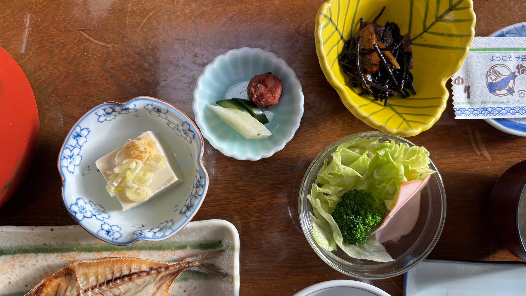 食事は部屋食 女将さんが部屋の中まで配膳を持ってきてくれる 机には自分で並べる方式 流石に金目鯛はなかったけど、料理は結構美味しかったよ 熱海は伊東の方でも朝晩両方出してくれる宿は減ってるから結構貴重かもしれない ちなみに素泊まりもあるけど近くに居酒屋や飲食店やローソンがあるからそんなに困らないと思う