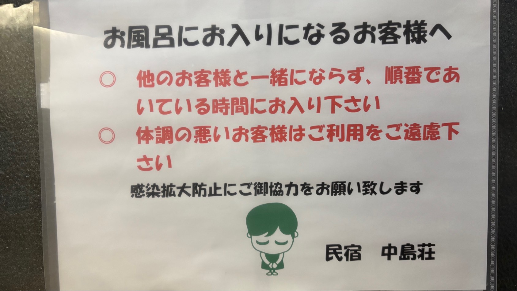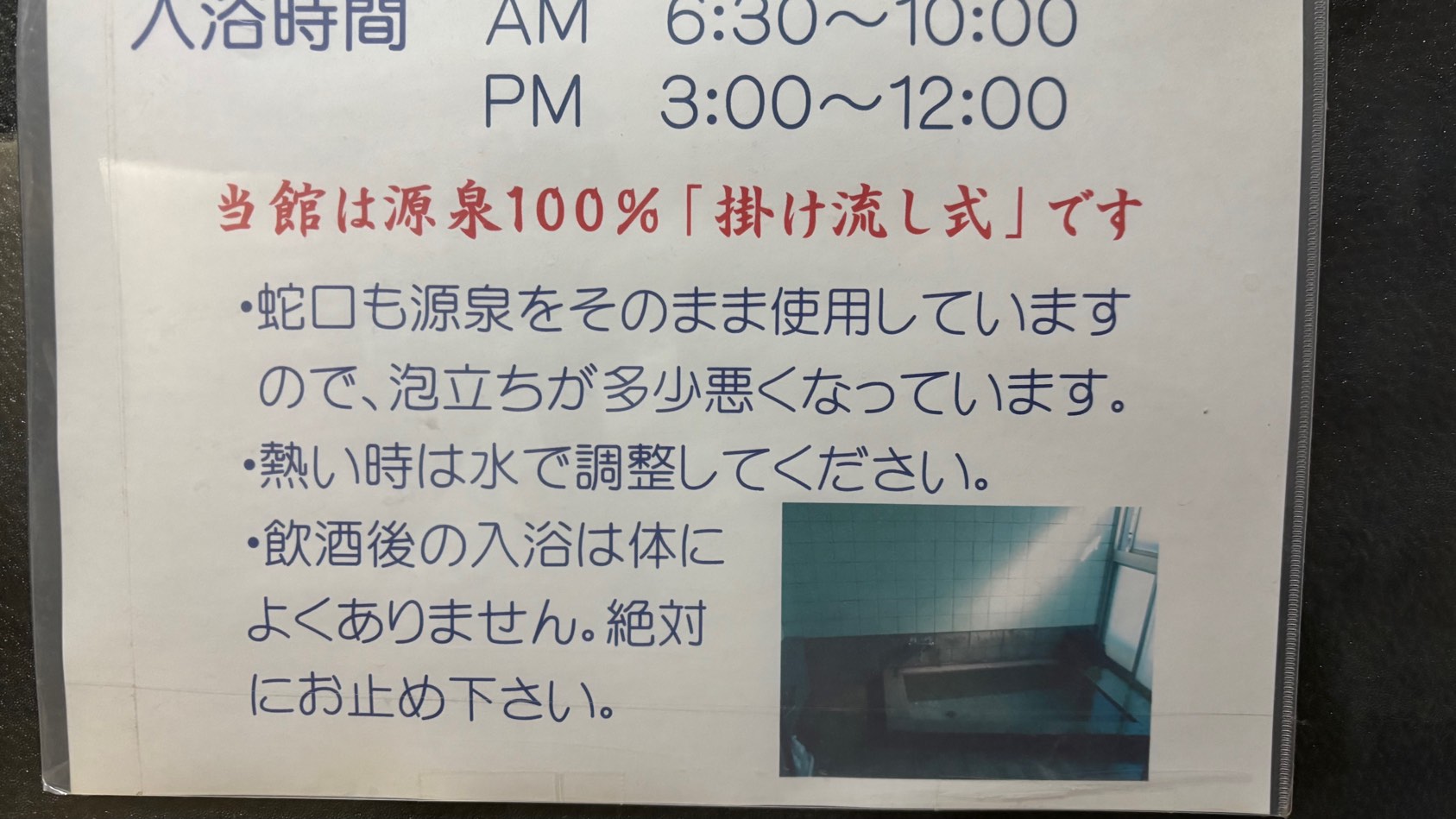なせが湯船の蛇口からお湯が注がれてた 入り口に貼られてる注意書きたち 24時から朝6時半までの間は入れない 連休中でこの値段なら悪くないんじゃないかな 駅からは徒歩10分くらいだったような気がする 目の前が国道だから夜のバイクのエンジン音がクソうるさい 建物が古いし階段しかないので足腰悪い人は注意 1番広い部屋にしか冷蔵庫がない、共用もない 一応冷やしたい物は主人に頼めば冷やしてくれるらしい 目の前が海岸なので夏は別の意味でクソうるさくなるかもしれない 立地的に当然だが夏が繁忙期だと言ってた 冬は連休でもそんなに泊まる人がいなかったから部屋が変更されたんだと思う 2重窓だから普通の車の音は気にならないが