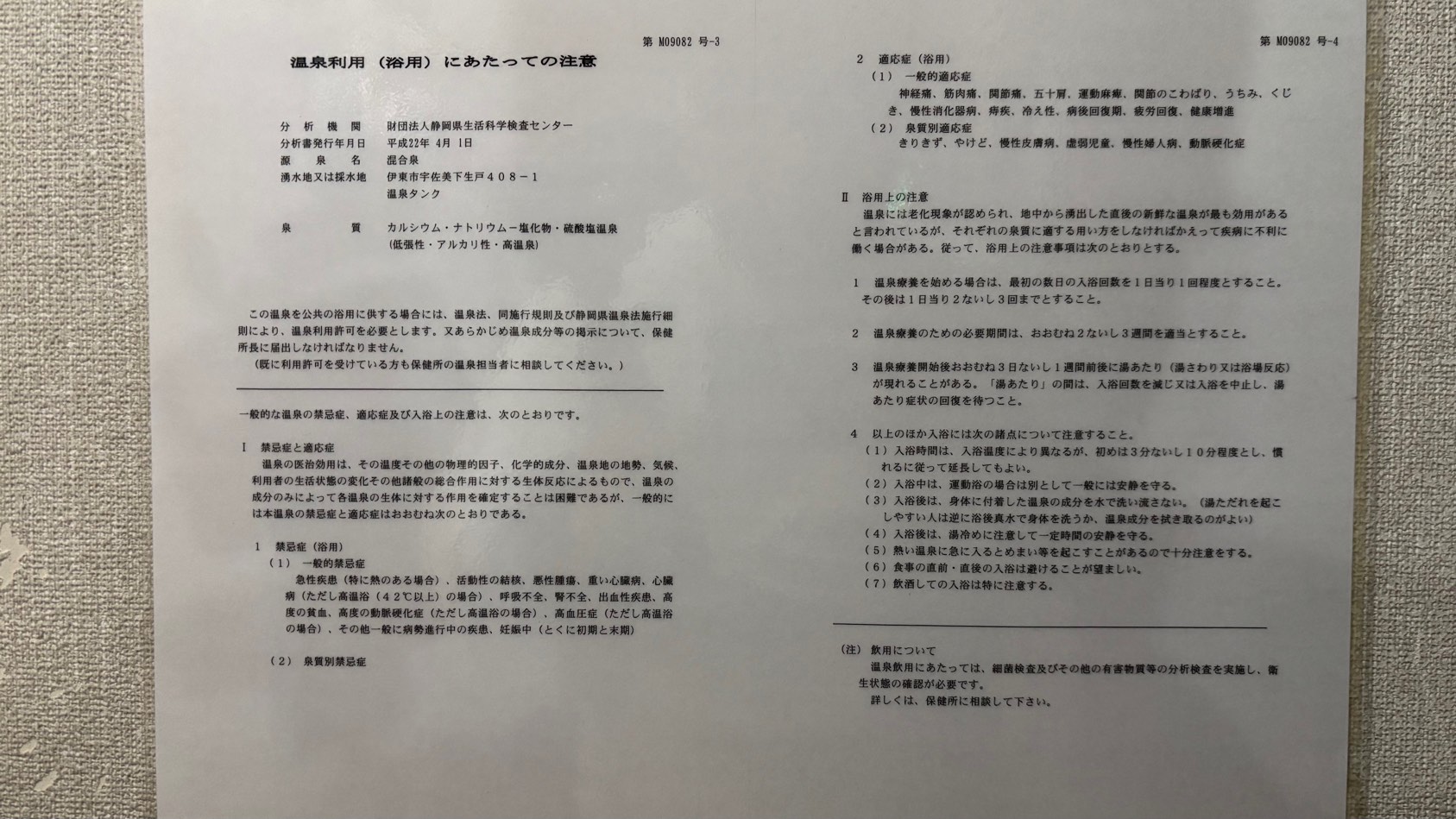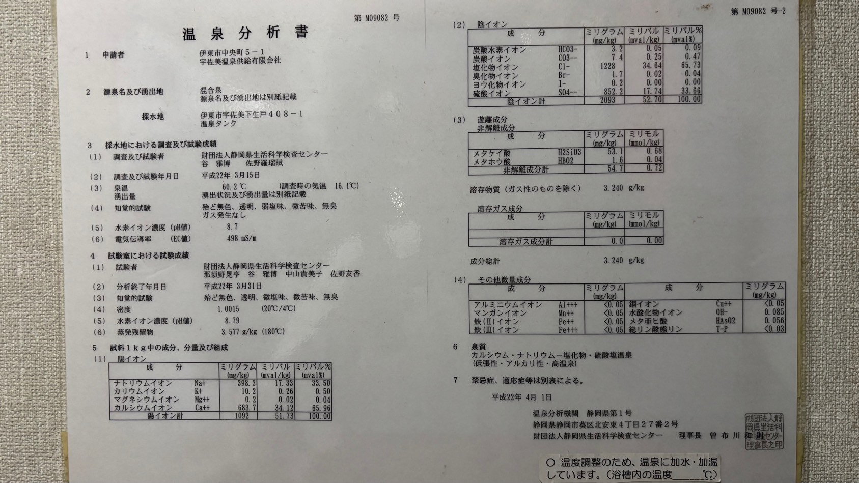 温泉 猫がいる宿と違って完全に源泉をそのまま使ってる なんだったら蛇口から温泉がそのまま出てくる、クソ熱いけど 直前に河津の方の日帰り温泉施設に入ったからわかるけど、変な臭いはしないからドア開けた瞬間にすぐわかった 塩化物系のアルカリ性単純温泉 湯船の底から白い析出物が漂ってた 熱かったら水道水入れて温度調整してって言ってたけど、