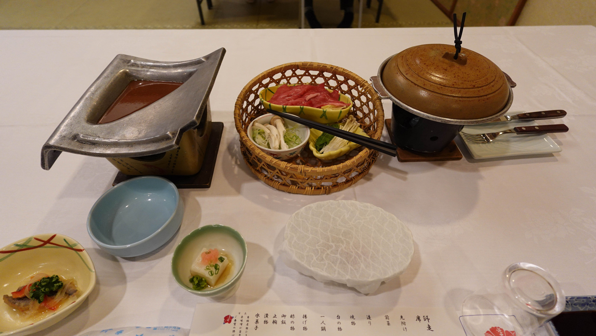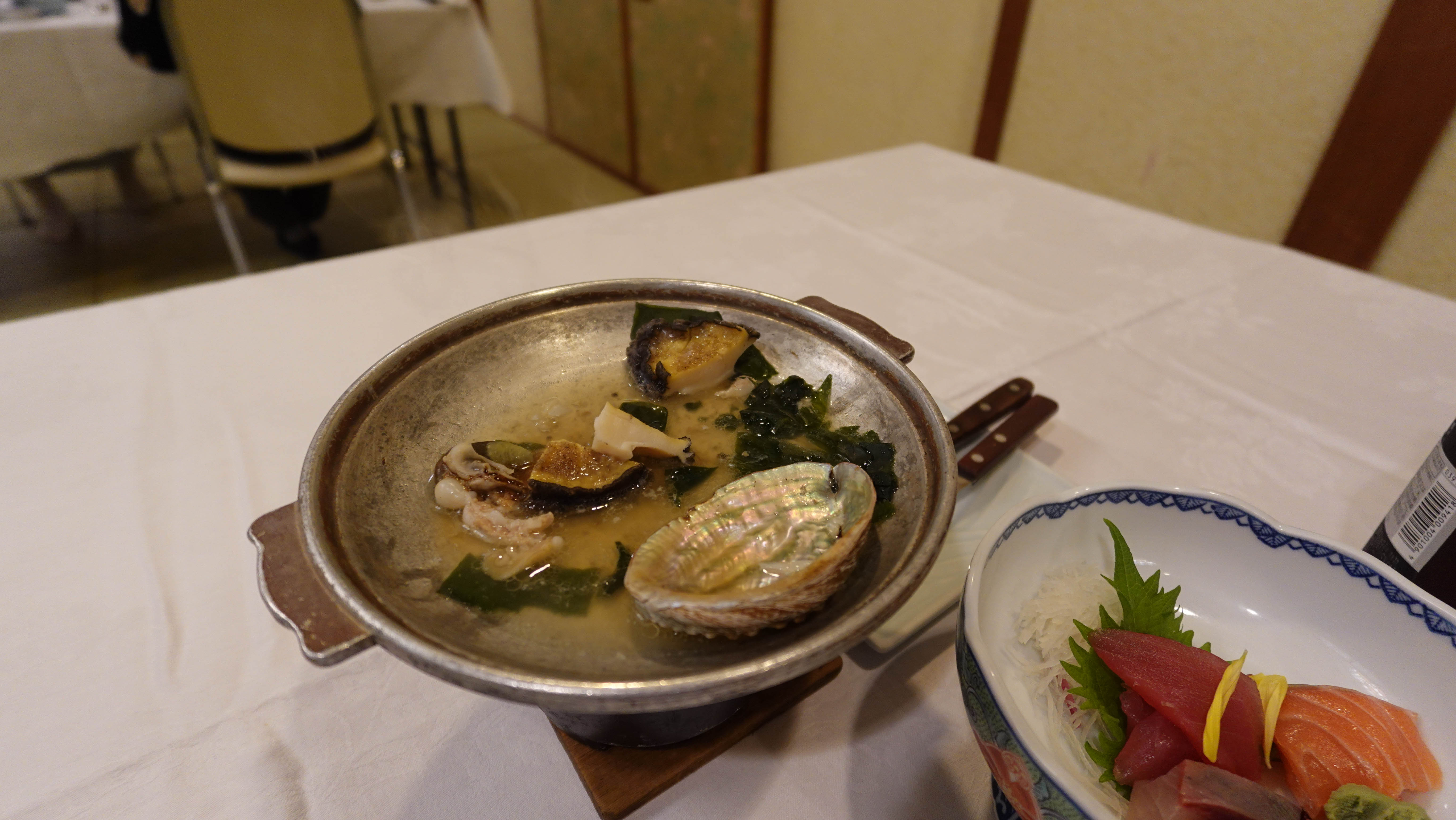 ググると原山を1300m掘ったらしい。 新幹線で豊橋から最初に入る星越トンネルの上が原山で蒲郡市のゴミ焼却場がある。 住所で言うと三谷町になるから三谷温泉ていうことになって、「三谷温泉のお湯」を蒲郡各所の温泉宿は使ってるみたい。そりゃあ住所出せないよな。 営業時間はホームページでは15:00~23:00/06:00~09:00となってるが22:30分までに短縮。まあ沸かさなきゃいけないから費用がかかるんだろ。源泉かけ流しなんて夢のまた夢や。 夕食 宴会場で食う。 メインはアワビと八丁味噌の引きずり鍋。 八丁味噌の鮮やかな赤い色が食欲をそそるが、オレの食欲はそそられない。