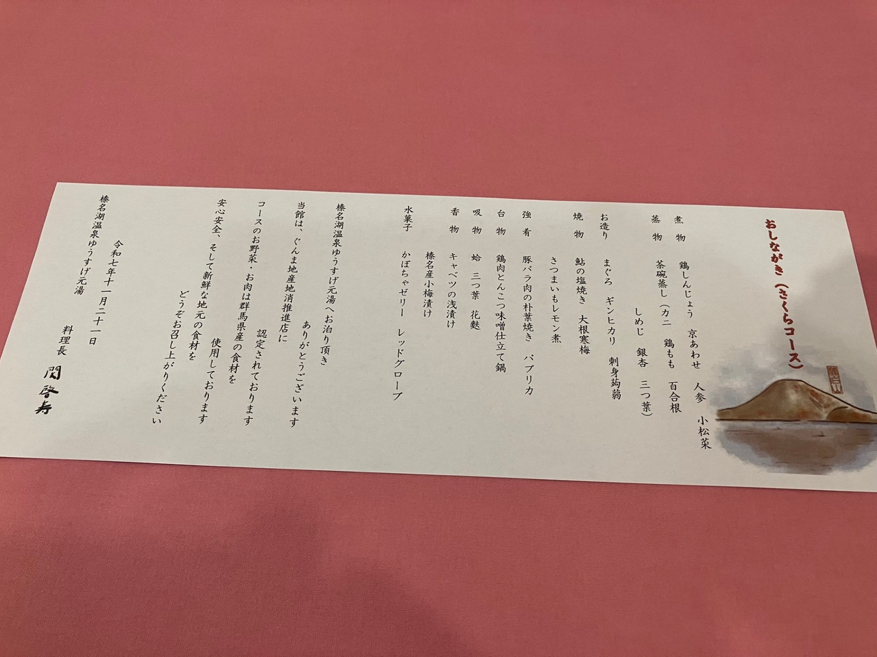 今年最後の3連休に有給1日プラスして群馬の温泉3か所に行ってきたので報告。 ・榛名湖温泉 ゆうすげ元湯 じゃらんから予約、(夕食付きの中で1番安い)鶏肉プラン10270円でオンライン決済、現地では入湯税150円(と夕食時の飲み物代)を支払い。-