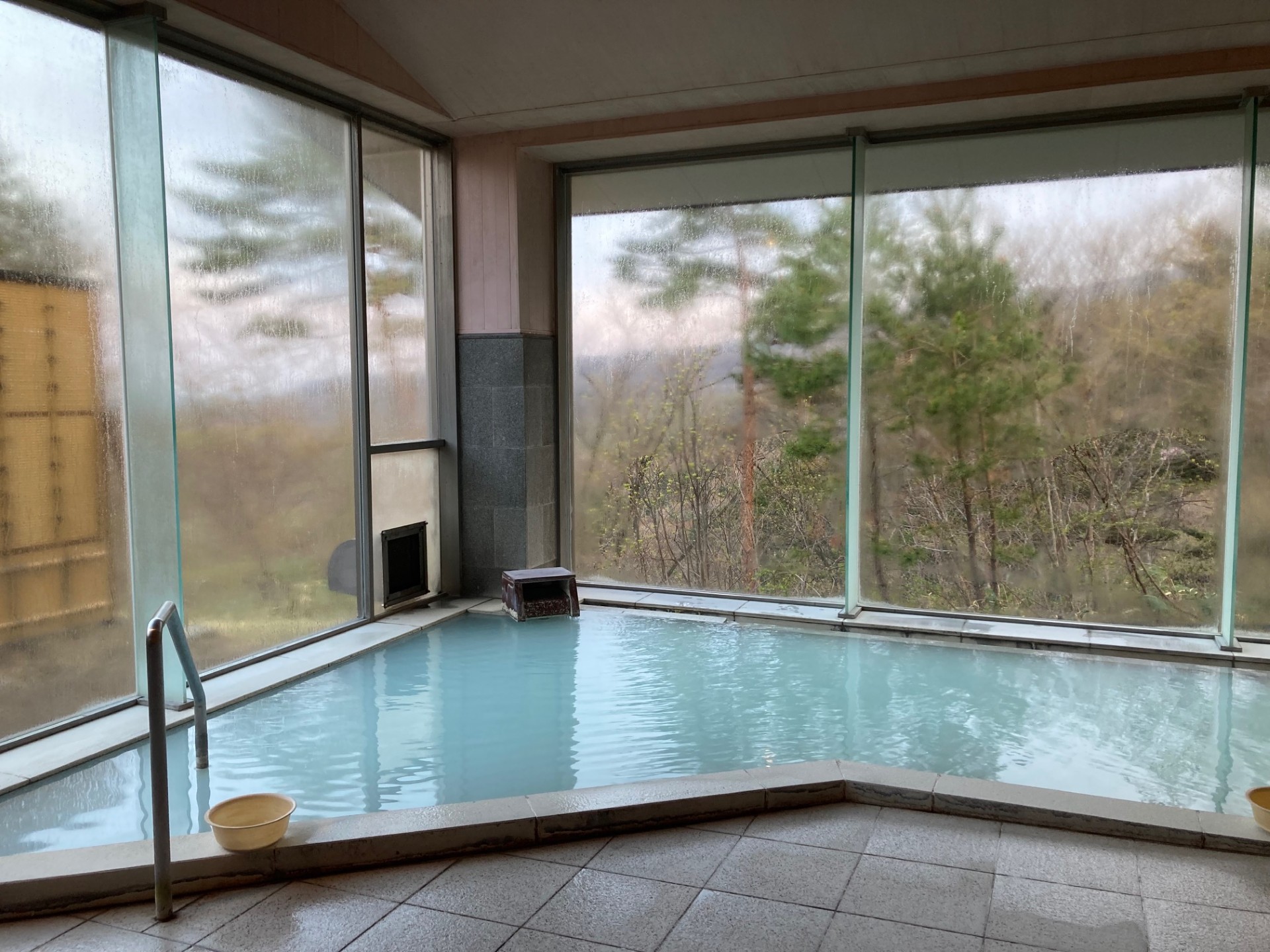 風呂は広いけど高湯温泉の硫黄泉がごぼごぼ音を立てて注ぎ込まれる。運が良かったのかコントロールされているのかは分からないけど適温でよく温まる、 なお浴室内は「NO PHONE ZONE」とあったので、誰もいないことを確認のうえ注意書きのあるドアの手前から撮影。別の場所にある露天風呂は注意書きの辺りからは見えない構造なので写真は無し。